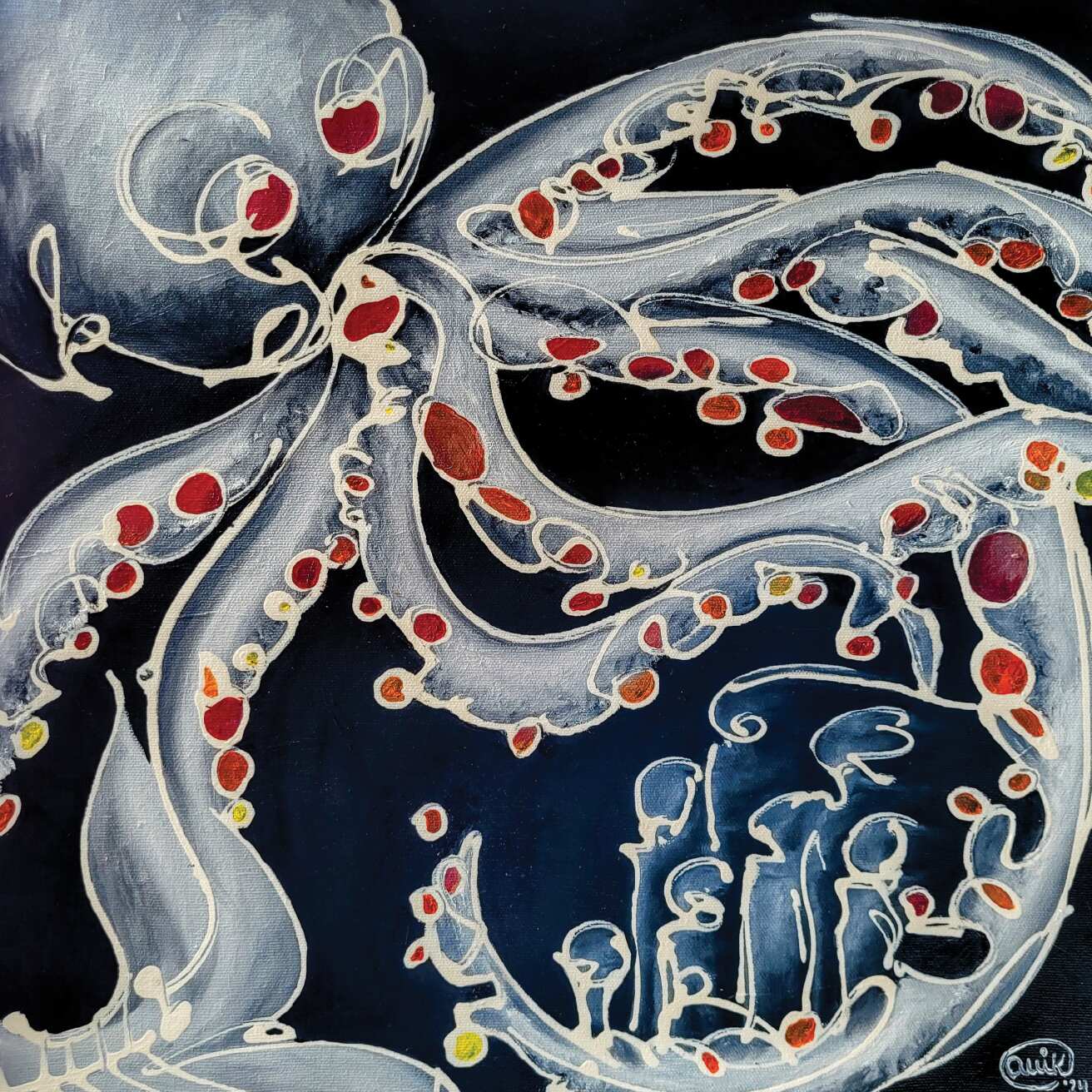C’est ainsi que, chemin faisant au cœur du long fleuve, le jeune béluga avait fait la rencontre de trois grands tentacules qui l’accueillirent avec empressement et se présentèrent à lui. Se dandinant fièrement de-ci, de-là, ils lui demandèrent où allait seul un si jeune baleineau. S’approchant de très près, ils l’effleuraient en se glissant sans gêne tout autour de son corps. Ces créatures étaient plutôt envahissantes, mais Kamouska ne s’en inquiéta guère. Quelque chose lui disait que ces êtres particuliers sauraient où trouver l’ingrédient magique qu’il recherchait. Il accepta donc leur familiarité et les trouva même amicaux.